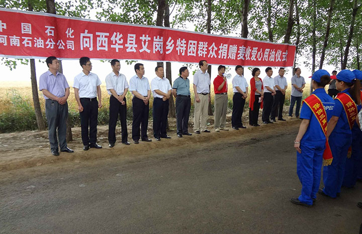 這次捐贈活動為西華縣艾崗鄉(xiāng)半截樓村群眾免費送來了10噸柴油,平均每臺收割機50升。這也是省委宣傳部聯(lián)合中石化河南石油分公司連續(xù)5年開展這項活動。5年來,為駐村群眾免費送油共計50噸。在活動現(xiàn)場,中石化的加油車為十幾臺收割機免費加了“愛心油”,并送給村民每人一個裝有汗衫、毛巾和手套的“愛心禮包”,有效地解決了困難群眾最關(guān)心、最急需的麥收用油問題,服務(wù)群眾、支援三夏走完最后一公里。三夏志愿服務(wù)隊員莊嚴承諾,為顆粒歸倉、豐產(chǎn)豐收提供最便利、最高效的服務(wù)。劉國明副巡視員在致辭詞中轉(zhuǎn)達了部領(lǐng)導(dǎo)對駐村幫扶點半截樓村群眾的問候,對中石化河南石油分公司履行國企職責,積極開展“石油惠農(nóng)服務(wù)優(yōu),支援三夏促豐收”扶貧濟困的愛心行動表示贊賞和感謝。劉國明副視員要求駐村工作隊,三夏期間繼續(xù)加大幫扶力度,對因病致貧、致寡家庭、軍烈屬、外出務(wù)工農(nóng)戶,組織青年志愿者無償幫扶收麥。呼吁社會各界樹立公益愛心理念,傳遞社會正能量,積極開展城市反哺農(nóng)村,企業(yè)支持農(nóng)業(yè),市民關(guān)愛農(nóng)民等活動,為早日建成美麗鄉(xiāng)村助一臂之力。(駐村工作隊)