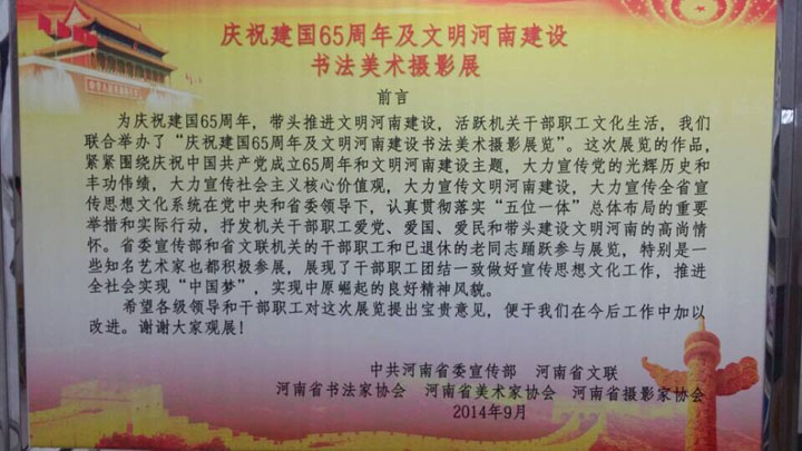為慶祝中華人民共和國成立65周年,大力宣傳社會(huì)主義核心價(jià)值觀,豐富廣大黨員干部職工的精神文化生活,抒發(fā)機(jī)關(guān)干部職工愛黨、愛國、愛民和帶頭建設(shè)文明河南的高尚情懷,展現(xiàn)機(jī)關(guān)干部職工團(tuán)結(jié)一致做好思想文化工作的精神風(fēng)貌,為打造“四個(gè)河南”推進(jìn)“兩項(xiàng)建設(shè)”、加快中原崛起河南振興富民強(qiáng)省唱響主旋律、凝聚正能量,河南省委宣傳部、河南省文聯(lián)、河南省美術(shù)家協(xié)、河南省書法家協(xié)會(huì)、河南省攝影家協(xié)會(huì)聯(lián)合舉辦的“慶祝建國65周年及文明河南建設(shè)書畫攝影展”,于2014年9月28日在省委辦公樓拉開序幕,本次展覽將持續(xù)一個(gè)月左右。
