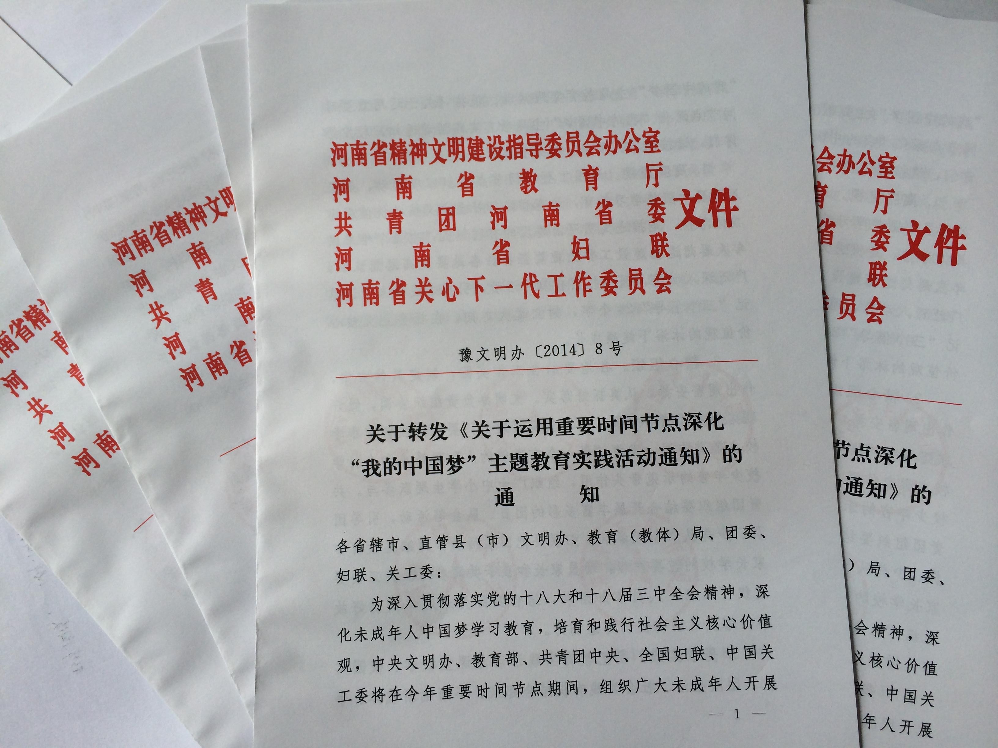 為深入貫徹落實黨的十八大和十八屆三中全會精神,深化未成年人中國夢學習教育,培育和踐行社會主義核心價值觀,中央文明辦、教育部、共青團中央、全國婦聯(lián)、中國關工委將在今年重要時間節(jié)點期間,組織廣大未成年人開展“我的中國夢”主題教育實踐活動?,F(xiàn)將有關事項通知如下。